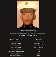 On February 28, 1968, Ron Reyes was born in Southern California while his young father, Ronald “Ronnie” Reyes, was fighting at Khe Sanh in the height of the Vietnam War’s landmark Tet Offensive. Ronnie served with the Delta Company, 1st Battalion, 9th Marines, 3rd Marine Division, from July 1967 through March 1968. On March 30th, 1968, Ronnie was retrieving a seriously wounded Marine Brother in battle, when he himself was mortally wounded. At just 19 years old, Ronnie had been a father for one month, to a son who would carry his name though they’d never meet. Ron grew up knowing his father through photographs, stories, and memories. He learned about the Vietnam War as a child, and as he grew into adulthood he came to realize that the war held more to his relationship with his father. He started learning more about the war, and meeting others whose families had been marked like his. Ron came to feel that after so many years, he was living a life in the shadow of the Vietnam War. He visited the AV Wall in 2013 when it was in Simi Valley. That visit moved Ron to honor his father and come out of the shadows, to embrace the scarred history as he never had before. Ron traveled to Vietnam in 2015, and again in July 2019. During both visits, he stood on the very ground where his father last stood, and formed lifelong friendships with people around the world, all through a common bond of the Vietnam War. Ron shares his story and experiences through spoken word, and has been featured in multiple news outlets including the New York Times and the Washington Post. Ron has also been featured in two documentaries about Gold Star Children and the Vietnam War, both of which have been broadcast nationally on PBS.